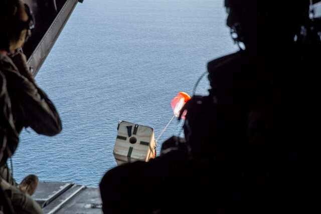 伍茲霍爾海洋研究所的一名乘務(wù)員和一名科學(xué)家在太平洋上空飛行了數(shù)千英尺,將一架美國海軍陸戰(zhàn)隊MV-22魚鷹式飛機的圓柱狀浮標(biāo)扔了起來。裝有數(shù)據(jù)收集傳感器以測量水下狀況,浮子在打開橙色降落傘以緩解飛濺之前迅速墜落。