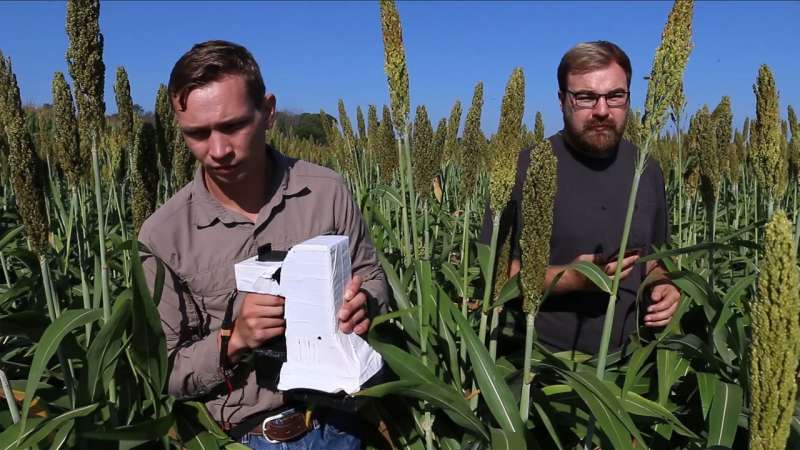 普渡大學(xué)農(nóng)學(xué)系的博士后研究助理尼爾·卡彭特(Neal Carpenter)(左)走遍了玉米和高粱領(lǐng)域,準備使用普渡大學(xué)開發(fā)的手持式傳感器來測量植物的健康狀況。馬修·芬頓(Matthew Fenton)使用智能手機收集數(shù)據(jù)。普渡大學(xué)農(nóng)業(yè)與生物工程學(xué)系的助理教授Jian Jin希望他的高光譜成像設(shè)備將在國內(nèi)外的植物科學(xué)家和農(nóng)民中廣泛使用。圖片提供:Purdue Research Foundation圖片/ Oren Darling