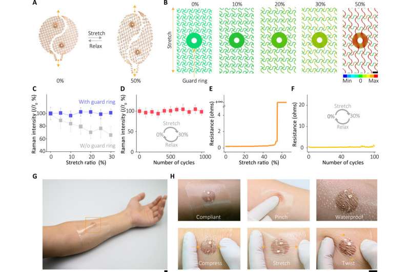 設(shè)備的機械特性。(A)傳感器變形時的光學圖像。(B)在各種變形下對可拉伸電極的保護環(huán)區(qū)域的FEM應變分布分析,表明該保護環(huán)可以將較大的變形隔離到軟彈性體中,從而避免了對SERS傳感組件產(chǎn)生潛在的破壞性塑性應變。(C)傳感器在各種變形下的SERS響應。(D)循環(huán)拉伸試驗后SERS傳感器的特性。(E)電極在各種變形下的電阻變化。(F)循環(huán)拉伸試驗后電極中的電阻變化。(G)在人體皮膚上安裝的傳感器的照片,以及(H)在各種條件下的照片。圖片來源:浙江大學劉向江。比例尺為1毫米(B)和1厘米(G和H)。誤差線定義為±SD。圖片來源:Science Advances,doi:10.1126 / sciadv.abe4553