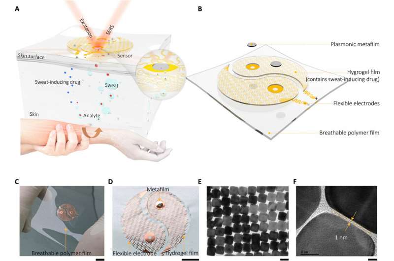 等離子體等離子材料集成的可穿戴SERS傳感設(shè)備。(A)顯示該設(shè)備工作原理和設(shè)計的示意圖;(B)由兩個主要組件(排汗組件和SERS感應組件)組成,其樣式看起來像是陰陽符號。插圖突出顯示了干膠片附近的按鍵感應界面。(C)該設(shè)備的光學圖像,(D)出汗組件的放大光學圖像。在螺旋形的分形網(wǎng)狀電極上安裝了一層薄薄的水凝膠層,上面裝有刺激汗腺分泌的分子(乙酰膽堿氯化物)。請注意,為了突出顯示的對比度,只有一個電極安裝了水凝膠層和等離激元超膜。圖片來源:浙江大學王英利。(E和F)安裝在電極中央的SERS傳感組件的高分辨率透射電子顯微鏡(TEM)圖像,該組件是由有序的銀納米立方體(NC)超晶格形成的等離子超薄膜。1 cm(C),5 mm(D),50 nm(E)和5 nm(F)的比例尺。圖片來源:Science Advances,doi:10.1126 / sciadv.abe4553