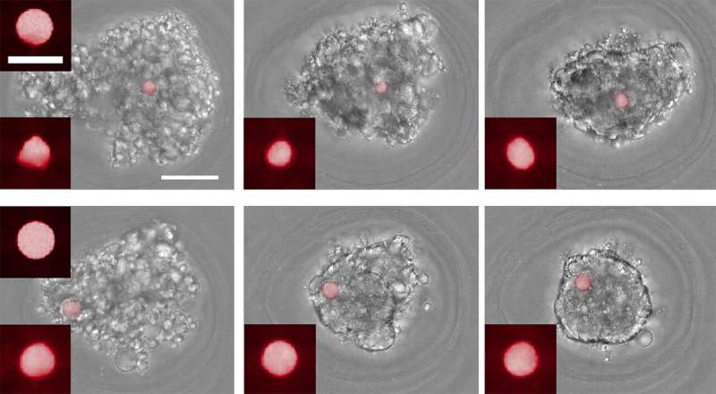 在另一組實(shí)驗(yàn)中,研究人員將傳感器球體添加到預(yù)先形成的細(xì)胞團(tuán)中,以觀察這些球體如何被吸收到團(tuán)塊中。一些球體已經(jīng)用膠原蛋白涂層處理過,可以使細(xì)胞與傳感器結(jié)合,而另一些則沒有涂層。