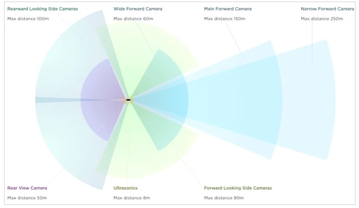 特斯拉將攝像頭和超聲波傳感器用于“自動(dòng)駕駛儀”。圖片由 特斯拉提供