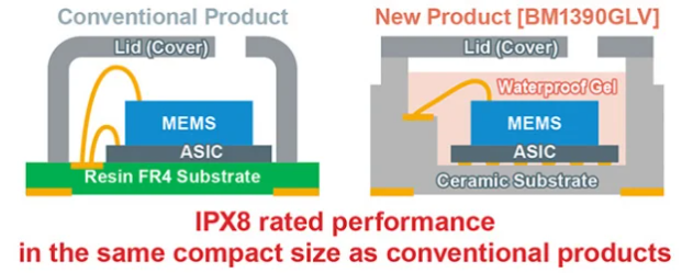 BM1390GLV 中采用的 MEMS 和控制電路可能與其他類似產(chǎn)品沒有太大區(qū)別;然而,新傳感器采用專有結(jié)構(gòu)和特殊的防水凝膠,使其適用于需要防水性能的工業(yè)設(shè)備和家用電器。