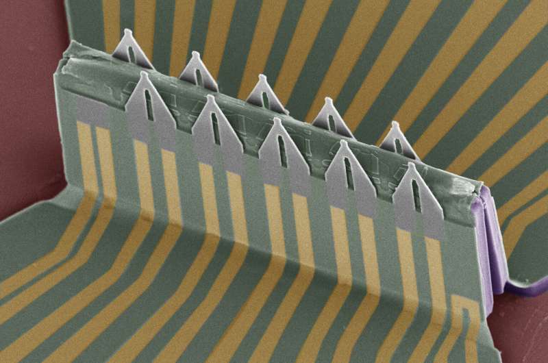 “彈出式”傳感器的 SEM 圖像,可直接測量心臟細(xì)胞內(nèi)電信號(hào)的速度和運(yùn)動(dòng)。