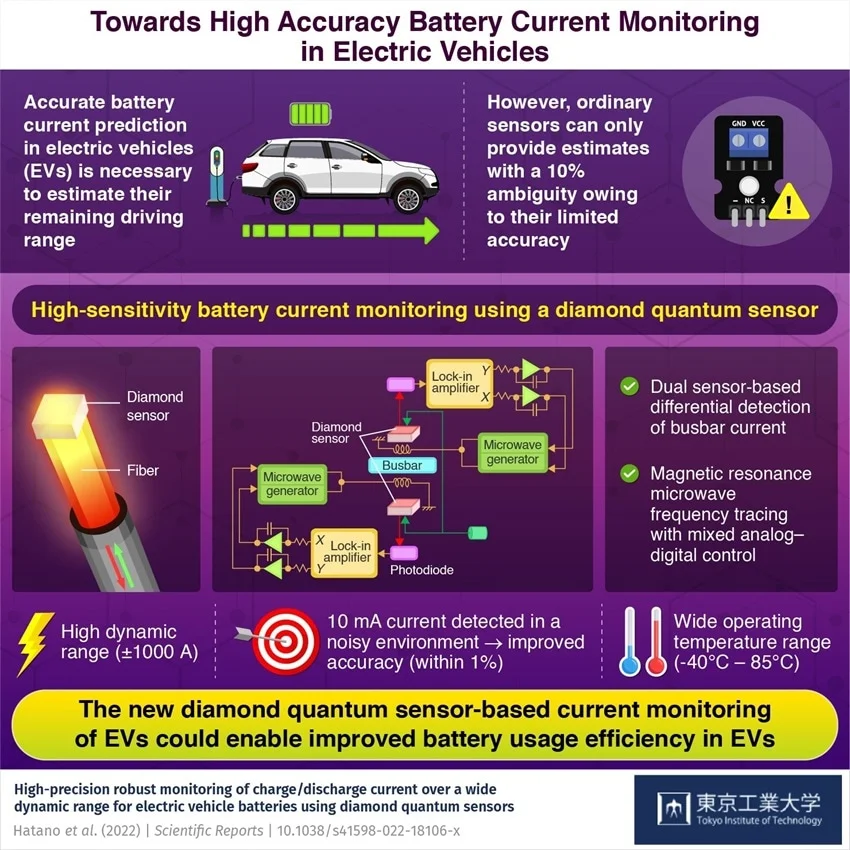 幸運的是,由東京工業(yè)大學(xué)(Tokyo Tech)的 Mutsuko Hatano 教授領(lǐng)導(dǎo)的日本研究團隊現(xiàn)在已經(jīng)提出了解決方案。在他們發(fā)表在《科學(xué)報告》上的研究中,該團隊報告了一種基于金剛石量子傳感器的檢測技術(shù),該技術(shù)可以在測量電動汽車典型的高電流時以 1% 的準(zhǔn)確度估計電池電量。
