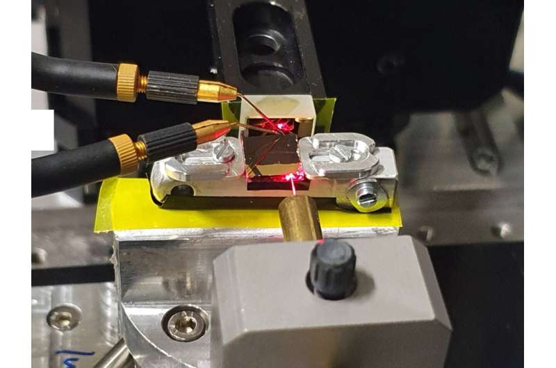 實(shí)驗(yàn)裝置:使用紅色對(duì)準(zhǔn)激光器來觀察從光纖到光波導(dǎo)的光束路徑及其在金鏡上的反射。兩個(gè)微探針用于接觸光電導(dǎo)體,其尺寸在亞波長(zhǎng)范圍內(nèi)。來源:Empa