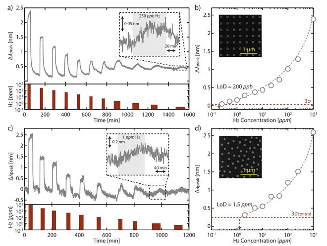 等離子體氫氣傳感器,是 Nature Communications 那篇論文的的研究對(duì)象。這種傳感器主要依賴于金屬納米顆粒中的光學(xué)共振。該類共振通常具有非常寬的光譜,所以傳統(tǒng)氫氣傳感器的檢測(cè)僅在百萬分之一。