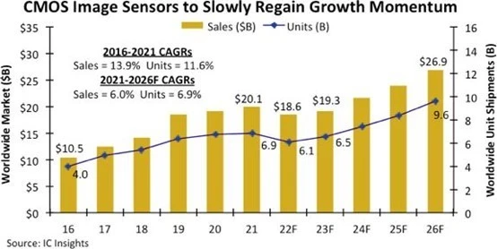 手機(jī)市場在為圖像傳感器市場帶來豐厚營收的同時(shí),也讓圖像傳感器行業(yè)不得不面臨智能手機(jī)需求疲軟的壓力。根據(jù) Counterpoint 的預(yù)測,2022 年上半年移動(dòng)圖像傳感器的出貨量將同比下降 14% (Yole 的數(shù)據(jù)則為 10%)。同時(shí),IC insights 更表示受到手機(jī)市場的需求不足的影響,在 2022 年,整個(gè)圖像傳感器營收可能迎來 13 年來的首次下跌。