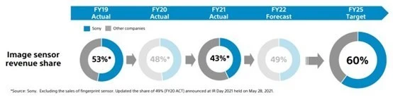 在今年 5 月舉行的索尼投資者關(guān)系日中的“圖像和傳感解決方案(I&SS)”部分,這位來自日本的圖像傳感器巨頭,除了公布了位于長崎的 Fab5 進(jìn)一步擴(kuò)建計(jì)劃以及包含 JASM 在內(nèi)的投資項(xiàng)目等擴(kuò)產(chǎn)計(jì)劃以外,還強(qiáng)調(diào)了要在 2025 財(cái)年將索尼占整個(gè)圖像傳感器市場的營收份額從 2021 財(cái)年的 43% 擴(kuò)大到 60%。