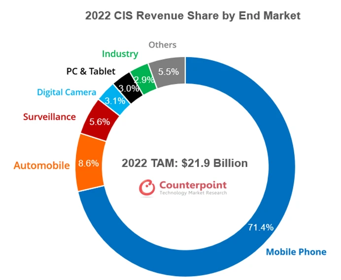 自從 20 多年前手機(jī)開始搭載相機(jī)模組以來,智能手機(jī)憑借著驚人的出貨量,逐漸成為圖像傳感器的頭號用戶。根據(jù) Counterpoint 今年的預(yù)測數(shù)據(jù),在 2022 年圖像傳感器的總營收中有高達(dá) 71.4% 是由手機(jī)貢獻(xiàn)的。