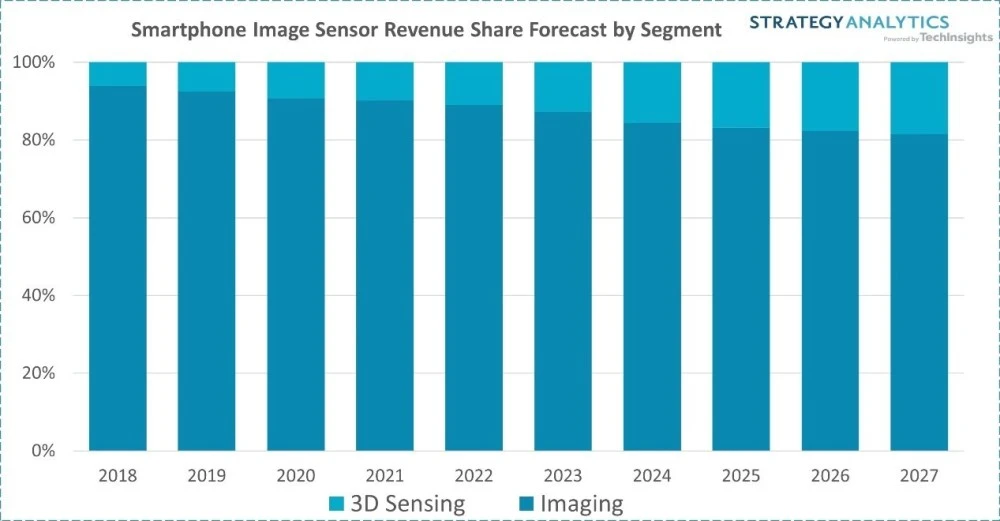 此外,圖像傳感器在非成像領(lǐng)域的應(yīng)用(例如汽車)也是一個(gè)機(jī)會(huì)。實(shí)際上,由于智能手機(jī)在圖像傳感器需求中的主導(dǎo)地位,對非成像領(lǐng)域圖像傳感器的強(qiáng)勁需求很可能被忽視了!拔艺J(rèn)為這一趨勢將繼續(xù)增長。我對此很有信心,因?yàn)樵趫D像傳感器的許多應(yīng)用中,圖像本身并不是最終目標(biāo)”,知名圖像傳感器博客 Image Sensors World 的作者之一 Atul Ingle 在《集微訪談》節(jié)目中接受筆者采訪時(shí)表示。實(shí)際上,根據(jù) Strategy Analytics 的數(shù)據(jù),即便在手機(jī)領(lǐng)域,用于空間傳感的圖像傳感器營收占比也呈現(xiàn)著逐年遞增的趨勢。