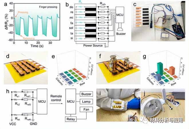 綜上所述,壓阻式傳感器由高彈性3D多孔PU海綿組裝而成,該海綿包裹有導(dǎo)電RGO層,在壓縮過程中提供導(dǎo)電路徑。當(dāng)受到外部刺激時,導(dǎo)電RGO層中的微裂紋、變形和海綿骨架的接觸會導(dǎo)致電阻變化,使海綿傳感器具有更高的靈敏度(17.65 kPa–1)和長期耐用性(8000 次循環(huán))。此后,傳感器可用于準(zhǔn)確檢測有規(guī)律的人體運動(例如,手指彎曲、手腕彎曲),或識別具有不同輸出電信號的各種重量的物體。此外,集成傳感器陣列和信號采集電路應(yīng)用于柔性電子鋼琴制造、電子皮膚以及通過藍(lán)牙技術(shù)遠(yuǎn)程實時控制家用電子產(chǎn)品,為柔性電子在智能應(yīng)用場景中提供了可行的嘗試。