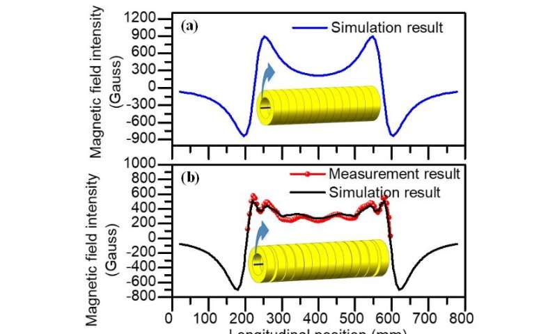 根據(jù)釹鐵硼(NdFeB)永磁環(huán)的磁場分布特征,他們以非等距形式組合了14個(gè)相同的釹鐵硼永磁環(huán),在380 mm的長度上獲得了平均磁場強(qiáng)度為346高斯的靜態(tài)磁場。通過將Herriott電池同軸擬合到永磁體陣列上,線性偏振光與樣品之間的相互作用大大增強(qiáng)。