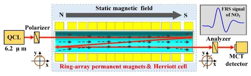 低功率法拉第旋轉(zhuǎn)光譜(FRS)二氧化氮(NO2)基于環(huán)形陣列永磁體的傳感器是由中國科學(xué)院合肥物理科學(xué)研究院高曉明教授領(lǐng)導(dǎo)的研究人員提出的,根據(jù)發(fā)表在《分析化學(xué)》上的一項(xiàng)研究。