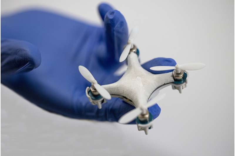 傳感器可以呈現(xiàn)出看似無窮無盡的各種形式。為了證明這一點,研究小組創(chuàng)造了病毒傳感無人機,其中的機身嵌入了傳感器材料。在飛行過程中,螺旋槳引導(dǎo)氣流通過無人機的多孔主體,著陸后可以對其進行檢查。在示例中,無人機對空氣傳播的病原體(SARS-CoV-2)做出反應(yīng),可以從遠程距離監(jiān)測環(huán)境。