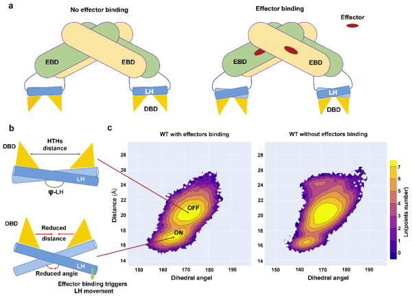 中國(guó)科學(xué)院天津工業(yè)生物技術(shù)研究所研究員鄭平團(tuán)隊(duì)等以原核生物中轉(zhuǎn)錄調(diào)控因子家族——LTTR家族的LysG和BenM為研究對(duì)象,通過(guò)分子對(duì)接、分子動(dòng)力學(xué)模擬和定向進(jìn)化等技術(shù)解析了效應(yīng)物結(jié)合域與DNA結(jié)合域間的鉸鏈區(qū)的調(diào)控功能及其調(diào)控機(jī)制。研究進(jìn)一步對(duì)僅包含約30個(gè)氨基酸的鉸鏈區(qū)進(jìn)行定向進(jìn)化,可快速獲得響應(yīng)性能顯著提升的突變體,從而開(kāi)發(fā)了一種TF型生物傳感器設(shè)計(jì)改造與性能提升的通用策略。該策略應(yīng)用于堿性氨基酸生物傳感器LysG的改造提升,獲得的LysG突變體在賴(lài)氨酸合成關(guān)鍵酶的高通量篩選和合成途徑的動(dòng)態(tài)調(diào)控中展示出更好的應(yīng)用效果。