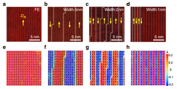 圖3.插層對疇寬度的調(diào)控及鐵電相到反鐵電相的轉變。a-d、具有不同周期的180°疇HAADF-STEM圖像;e-h、分別為對應圖a-d中的離子位移分布。