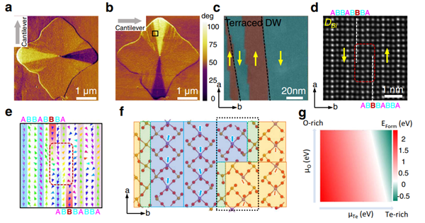 圖5.疇壁臺階的形成及插層對疇壁取向的影響。a-b、樣品中扇形鐵電疇的面內(nèi)PFM圖像;c、扇形鐵電疇邊緣處大量臺階形成的傾斜疇壁面;d-e、疇壁臺階的原子尺度HAADF-STEM圖像及對應的離子位移分析;f、弛豫后的疇壁臺階結構模型;g、Te和O濃度對疇壁臺階形成焓的影響。