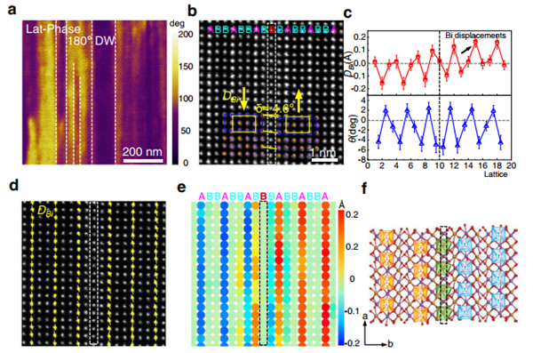 圖2.Bi/Te插層誘導的180°鐵電疇的形成。a、Bi2TeO5中典型條狀180°鐵電疇的面內(nèi)PFM;b、180°鐵電疇壁的原子尺度HAADF-STEM圖;c-e、180°鐵電疇壁處鐵電離子位移(DBi)及晶格畸變(晶格轉角θ)的原子尺度分析;f、弛豫后180°鐵電疇的結構模型。