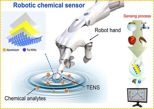為了制造他們的TENS,該團隊使用了一系列對汞敏感的碲納米線。這使得他們的傳感器具有高度選擇性,即使在復(fù)雜的樣品中也能挑選出目標(biāo)。研究人員將TENS安裝在機器人手的指尖上,并反復(fù)將其觸摸到樣品溶液中。電壓的變化以無線方式實時傳輸?shù)街悄苁謾C,對應(yīng)于汞離子的存在與否。