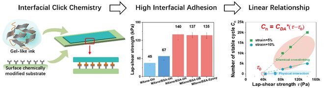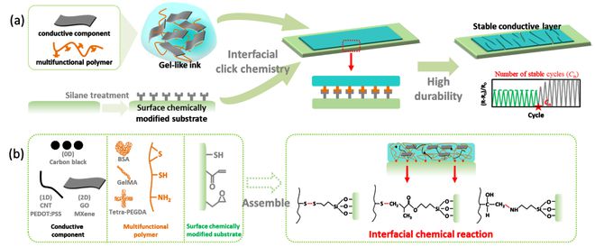 圖2 基于“點(diǎn)擊化學(xué)”構(gòu)建導(dǎo)電層與基底間強(qiáng)界面黏附推動(dòng)傳感器具有高耐久性。