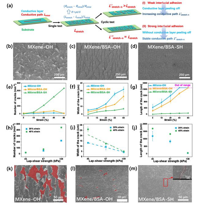 為解釋界面黏附強(qiáng)度影響傳感器耐久性的工作機(jī)理,作者針對(duì)具有不同界面黏附的傳感器的導(dǎo)電層進(jìn)行了掃描電鏡表征和分析。圖4表明,隨著界面黏附強(qiáng)度的提升,導(dǎo)電層在固定應(yīng)變下產(chǎn)生的裂痕大。ㄩL(zhǎng)度和寬度)減小,但是數(shù)目明顯增多。這種現(xiàn)象是傳感器在保持較高拉伸性的前提下大幅提升拉伸性的原因。在1000次的循環(huán)測(cè)試之后,具有較弱界面黏附的傳感器產(chǎn)生了明顯的導(dǎo)電層剝落,而強(qiáng)界面黏附展示了穩(wěn)定的導(dǎo)電層與裂痕維持能力,這是傳感器耐久性提升的根本原因。