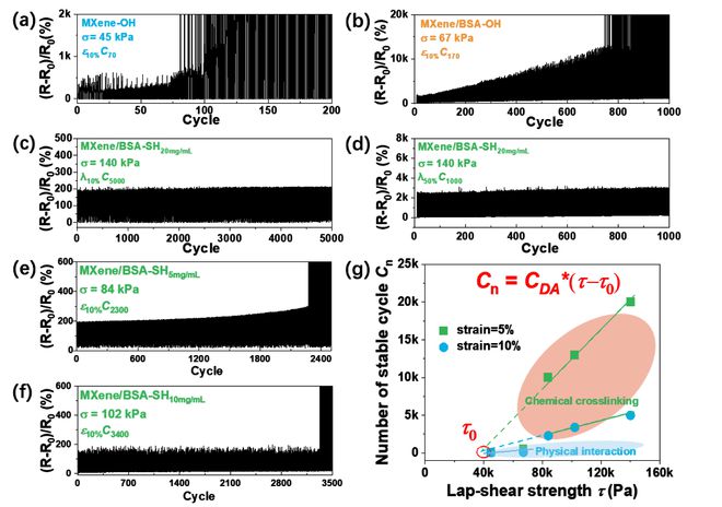 基于“點(diǎn)擊化學(xué)”制備的柔性應(yīng)變傳感器具有可控的界面黏附強(qiáng)度,作者仔細(xì)的研究了界面黏附強(qiáng)度與耐久性之間的關(guān)系。首先,作者提出了用于表征耐久性的參數(shù):穩(wěn)定循環(huán)次數(shù) C n,該參數(shù)表示傳感器在固定應(yīng)變下能夠穩(wěn)定輸出電阻信號(hào)的次數(shù)。通過(guò)調(diào)控界面交聯(lián)密度得到了除界面黏附強(qiáng)度外其他因素皆相同的傳感器,并探索了黏附強(qiáng)度與穩(wěn)定循環(huán)次數(shù)之間的關(guān)系。如圖3所示,隨著界面黏附強(qiáng)度的增加,穩(wěn)定循環(huán)次數(shù)隨之線性增加,并且該線性關(guān)系的斜率與應(yīng)變大小,界面類(lèi)型等因素都有關(guān),作者推導(dǎo)出二者之間的轉(zhuǎn)換因子"durability-adhesion coefficient ( CDA)”。