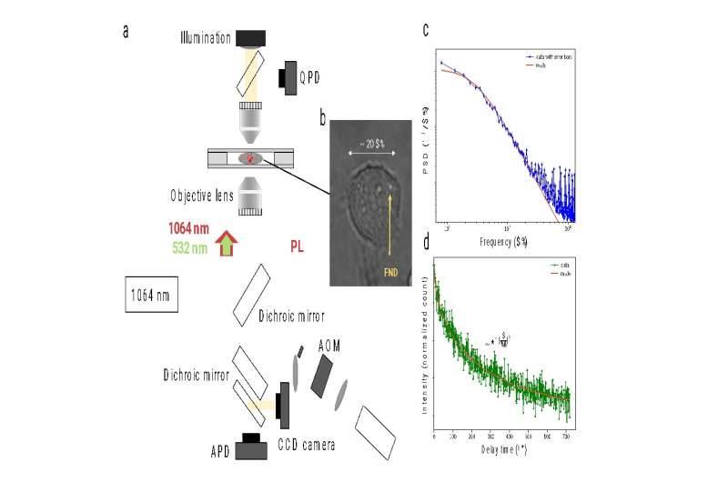 研究人員使用光鑷將納米金剛石顆粒捕獲在單個白血病細(xì)胞內(nèi),然后演示如何使用這些顆粒來測量細(xì)胞內(nèi)的磁噪聲。