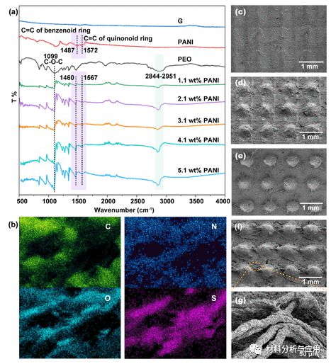 圖2.PEO/PANI/G 印刷傳感膜的 FTIR、EDS 和 SEM 結果