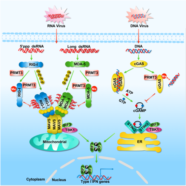 PRMT3催化RIG-I、MDA5和cGAS的精氨酸甲基化,抑制抗病毒天然免疫反應(yīng);