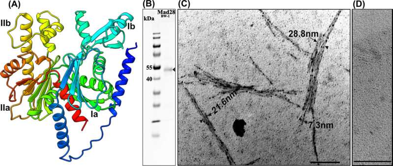 (A) Alphafold預測的BW-28的Mad1三維結構模型。結構中標明了四個肌動蛋白結構域 Ia、Ib、IIa 和 IIb。(B) 純化的 N 端 His 標簽的 Mad28 的 SDS-PAGEBW-1型來自大腸桿菌。(C)Mad28的體外聚合BW-1型在存在 ATP-γ-S 且沒有 ATP (D) 的情況下,通過 TEM 可視化。比例尺,100 nm。圖片來源:mBio (2023)。DOI: 10.1128/mbio.01649-23