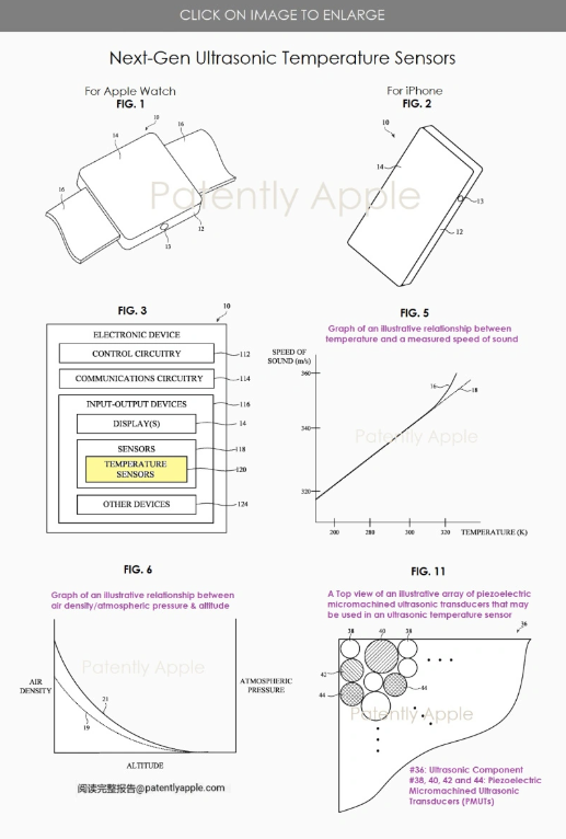 專利文件中還展示了該溫度傳感器的可能應用場景,包括安裝在Apple Watch和iPhone等設備上。此外,專利圖還詳細解釋了傳感器的工作原理、溫度與聲速之間的關系、空氣密度與大氣壓強對海拔的影響,以及壓電微機械超聲波換能器陣列的構(gòu)造等。