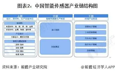 智能傳感器是物聯(lián)網(wǎng)技術(shù)的最底層和最前沿,對物聯(lián)網(wǎng)產(chǎn)業(yè)發(fā)展有著十分重要的意義。從產(chǎn)業(yè)鏈來看,智能傳感器上游主要為設(shè)計、原材料以生產(chǎn)設(shè)備供應(yīng);中游為智能傳感器器件加工制造與封裝測試;下游是終端產(chǎn)品制造,其中以消費電子、工業(yè)控制、汽車電子、醫(yī)療電子等應(yīng)用領(lǐng)域為主。