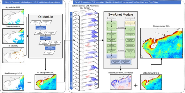 該研究結(jié)合最優(yōu)插值(OI)方法和深度學(xué)習(xí)網(wǎng)絡(luò)框架(SwinUnet),構(gòu)建了基于數(shù)據(jù)異常預(yù)期方差的深度學(xué)習(xí)模型——OI-SwinUnet。該方法利用最優(yōu)插值,基于空間鄰域信息,融合衛(wèi)星觀測和現(xiàn)場觀測數(shù)據(jù),并利用SwinUnet對大區(qū)域長時序的遙感觀測時間序列數(shù)據(jù)進行多尺度特征學(xué)習(xí),重建缺失的葉綠素a濃度數(shù)據(jù),進而獲得南海區(qū)域逐日1km海表葉綠素產(chǎn)品。