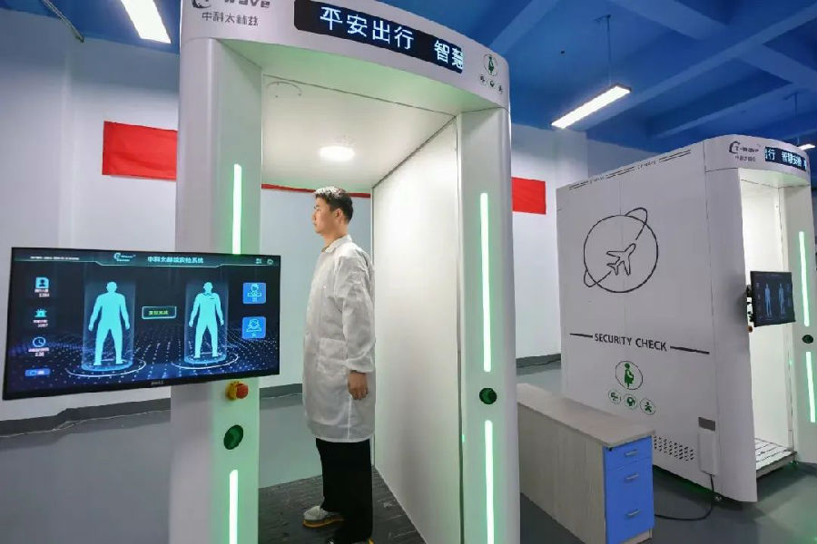 圖| 安徽中科太赫茲科技有限公司工作人員在采集主動式太赫茲人體安檢設(shè)備的成像數(shù)據(jù)