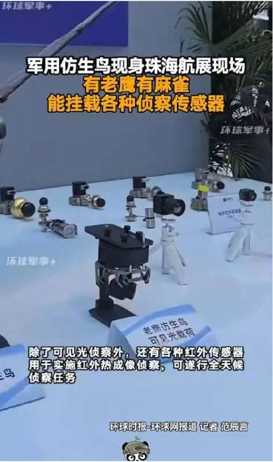 軍用仿生鳥:在珠海航展現(xiàn)場的“中國軍工”展區(qū),展出了許多軍用仿生鳥及其配套的各種傳感器。它們之中有老鷹有麻雀,能掛各種偵察傳感器。這種形態(tài)逼真的仿生鳥在執(zhí)行隱蔽偵察任務(wù)中,撲翼無人機在空中盤旋,對手可能根本無法意識到自己正處于監(jiān)視中,猶如好萊塢電影中的畫面。