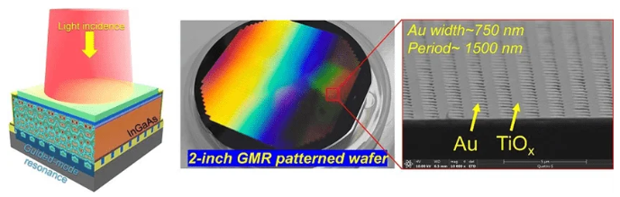 本研究中提出的集成在導(dǎo)模共振(GMR)結(jié)構(gòu)上的銦鎵砷光電二極管圖像傳感器示意圖(左)、制造出的晶圓照片以及周期性圖案的掃描電子顯微鏡(SEM)圖像(右)。圖片來(lái)源:韓國(guó)科學(xué)技術(shù)院