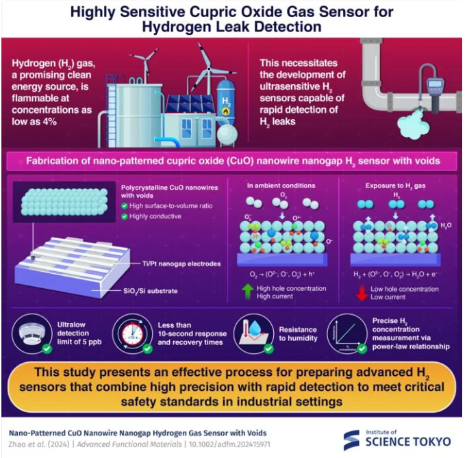 本研究提出了一種制備先進(jìn)氫氣(H₂)傳感器的有效工藝,該傳感器兼具高精度與快速檢測的特點(diǎn),能夠滿足工業(yè)環(huán)境中的關(guān)鍵安全標(biāo)準(zhǔn)。圖片來源:東京科學(xué)研究所