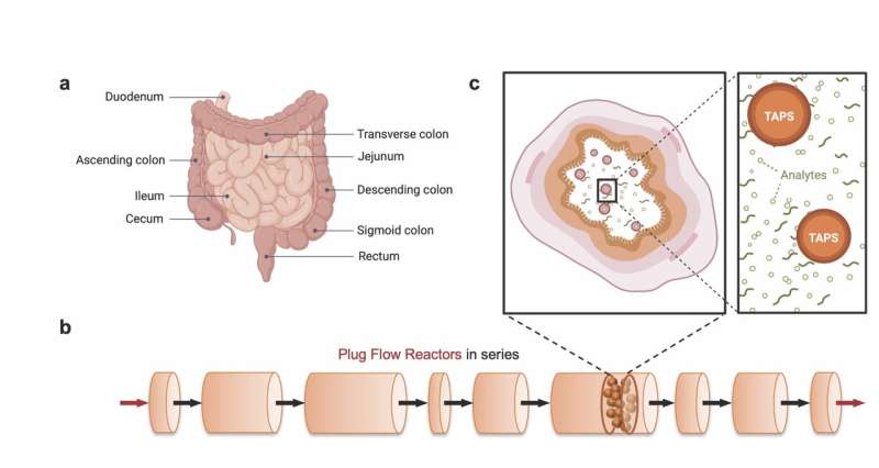 人體腸道系統(tǒng)(a)可被視作一系列活塞流反應(yīng)器(b),這是一種用于描述流動(dòng)圓柱體系內(nèi)化學(xué)反應(yīng)的模型。具有時(shí)間感知能力的微粒傳感器(c)在活塞流系統(tǒng)中移動(dòng),檢測被稱為分析物的目標(biāo)化學(xué)物質(zhì)。圖片來源:馬寧等人,2025 年。部分圖片由 BioRender 軟件制作。