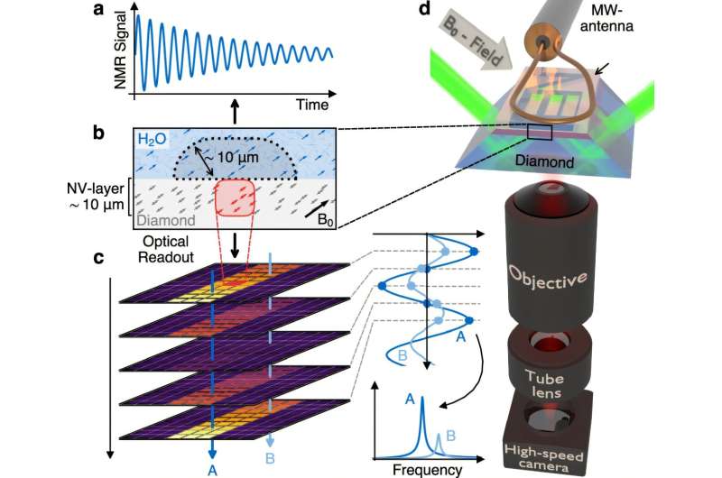 這種在原子層面經(jīng)過(guò)特殊制備的鉆石,可作為一種對(duì) MRI 磁場(chǎng)高度敏感的量子傳感器。當(dāng)用激光照射時(shí),它會(huì)產(chǎn)生一個(gè)包含 MRI 信號(hào)信息的熒光信號(hào)。這個(gè)信號(hào)由高速相機(jī)記錄下來(lái),從而能夠生成微觀層面分辨率顯著更高的圖像。