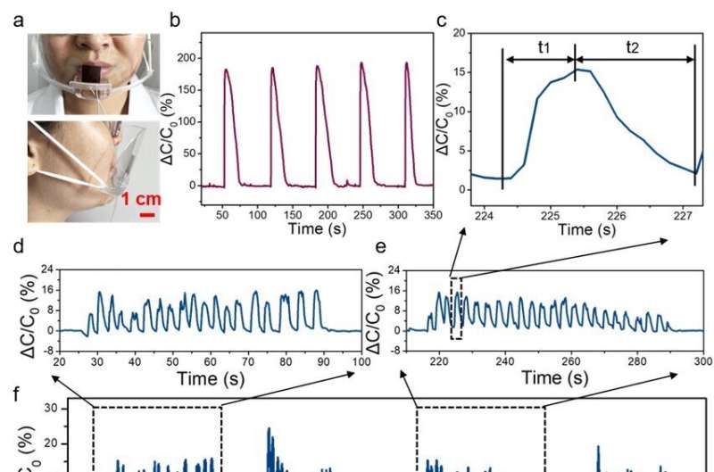 (a) 佩戴在受試者臉上的商用口罩上的濕度傳感器照片。(b) 受試者在休息狀態(tài)下用嘴進(jìn)行的人體呼吸測試。(c) 傳感器的響應(yīng)和恢復(fù)時間。(d)-(f) 受試者在休息狀態(tài)下用鼻子實(shí)時監(jiān)測呼吸頻率。實(shí)時監(jiān)測手掌濕度,(g) 飲用熱水時和 (h) 鍛煉時的情況。圖片來源:《光電子進(jìn)展》(2023 年)。DOI: 10.29026/oea.2023.220172