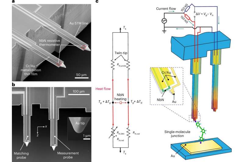 用于單分子熱測(cè)量的雙尖端氮化鈮掃描熱顯微鏡(SThM)探針。a. 雙尖端掃描熱顯微鏡探針的掃描電子顯微鏡(SEM)圖像(側(cè)視圖),在兩個(gè)幾何形狀相同的梁上有氮化鈮溫度計(jì),并配有用于電流測(cè)量的鉻 / 金金屬化層和金電極線。b. 探針的掃描電子顯微鏡圖像(俯視圖),顯示了雙尖端的接近程度(在 z 方向上偏移 20 微米)。插圖:鍍金尖端的末端。c. 用于量化單分子結(jié)熱導(dǎo)率的測(cè)量方案示意圖,單分子結(jié)被困在金樣品和雙尖端探針的較長(zhǎng)尖端之間。使用全惠斯通電橋電路來測(cè)量由通過分子結(jié)的熱流引起的兩個(gè)尖端之間的溫差。一個(gè)熱阻網(wǎng)絡(luò)展示了從探針到散熱器的熱流(Q)路徑。這里 Rth,SMJ=1/Gth,SMJ,Rrad 是與環(huán)境的輻射熱阻。圖片來源:《自然材料》(2025 年)。DOI: 10.1038/s41563-025-02195-w