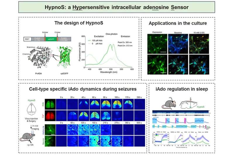 這種名為 “超靈敏細(xì)胞內(nèi)腺苷傳感器”(Hypersensitive intracellular adenosine Sensor, HypnoS)的工具,能夠在活體動物大腦中以高時空分辨率監(jiān)測癲癇發(fā)作或睡眠 - 覺醒周期中的 iAdo 動態(tài)變化。