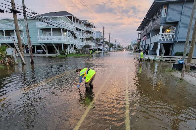 一項新研究發(fā)現(xiàn),沿海洪災發(fā)生頻率遠超此前認知,且廣泛使用的利用潮汐數(shù)據(jù)捕捉洪災的方法存在重大缺陷。圖片為研究人員在北卡羅來納州卡羅來納海灘采集洪水樣本。圖片來源:晴日洪水項目(Sunny Day Flooding Project)