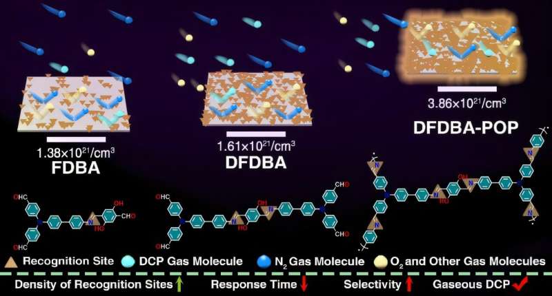 當(dāng) C=N 鍵密度達(dá)到 3.86×1021/cm3 且比表面積為 128.5 m2/g 時(shí),DFDBA-POP 對(duì)目標(biāo)分析物展現(xiàn)出優(yōu)異的傳感性能:對(duì)氣態(tài) DCP 的響應(yīng)時(shí)間僅 1 秒,且在鹽酸等 15 種結(jié)構(gòu)類似干擾物存在時(shí)仍保持高選擇性。此外,團(tuán)隊(duì)通過制備 DFDBA-POP 固態(tài)傳感器,驗(yàn)證了其對(duì)氣態(tài) DCP 的實(shí)際識(shí)別能力。
