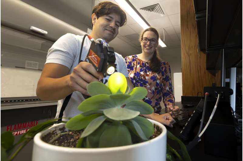 馬里奧・索托(左),作物、土壤與環(huán)境科學(xué)系碩士研究生,與阿肯色大學(xué)農(nóng)業(yè)分部及戴爾・邦珀斯農(nóng)業(yè)、食品與生命科學(xué)學(xué)院精準(zhǔn)農(nóng)業(yè)助理教授奧雷莉・龐塞特,共同展示一項(xiàng)用于測量除草劑對植物作用效果的研究設(shè)備。(圖片來源:阿肯色大學(xué)農(nóng)業(yè)分部)