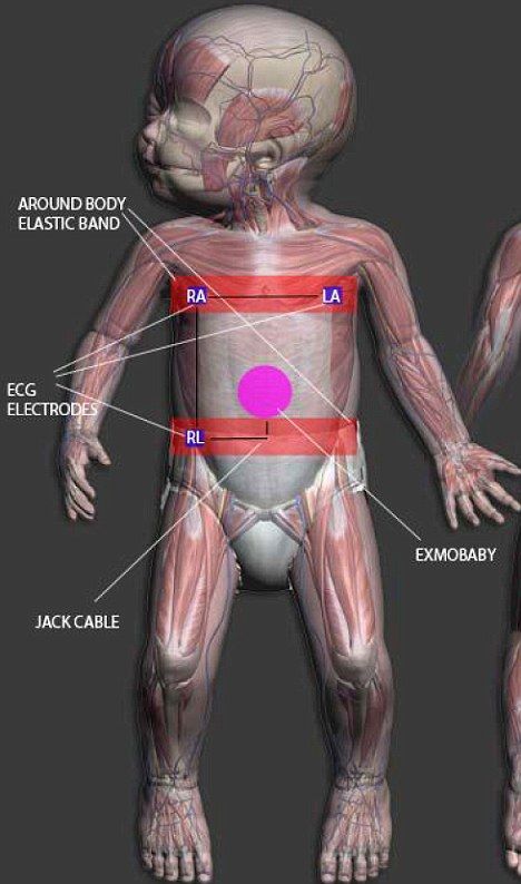Exmobaby嬰兒服纖維層內(nèi)安裝有一個(gè)溫度計(jì),一個(gè)心律監(jiān)控器以及動(dòng)作傳感器,能夠觀測到嬰兒的心跳、情緒及活動(dòng)情況。