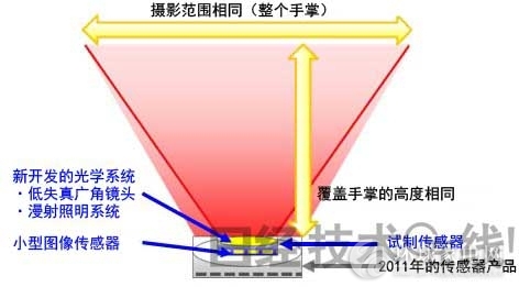 追求薄型小型化時,存在需要在保持原有認(rèn)證性能的前提下減小受光面積的課題。而且,為了確保與已有系統(tǒng)之間的兼容性,還要防止與原來的手掌靜脈傳感器拍攝的圖像產(chǎn)生差異,以免對認(rèn)證造成影響。為了解決這些課題,富士通研究所開發(fā)了以下兩項技術(shù):[1]利用手機(jī)及網(wǎng)絡(luò)攝像頭使用的小型圖像傳感器的技術(shù)、[2]以實現(xiàn)兼容性為目的的光學(xué)設(shè)計技術(shù)。