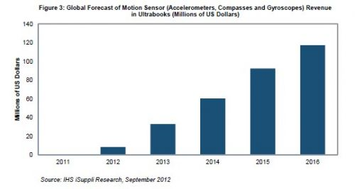 直到現(xiàn)在為止,筆記本中使用的唯一一種運(yùn)動(dòng)傳感器還是加速度計(jì),用于自由落體功能,可以在筆記本跌落時(shí)關(guān)閉硬盤,防止硬盤受損。隨著固態(tài)硬盤(SSD)得到采用,筆記本也就不必使用硬盤,因此加速度計(jì)的筆記本市場(chǎng)勢(shì)必萎縮。然而超級(jí)本的出現(xiàn)讓加速度計(jì)再度有了用武之地,比如可以用于屏幕自動(dòng)旋轉(zhuǎn),為羅盤與陀螺儀打開了一個(gè)新的市場(chǎng)。
