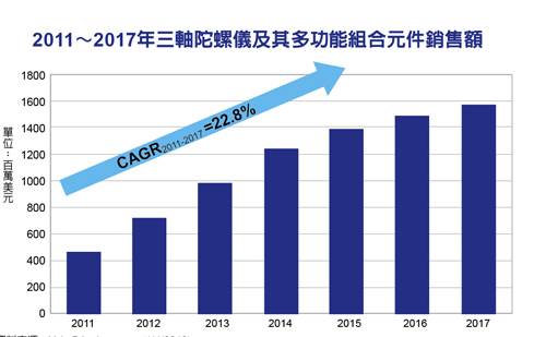 三軸陀螺儀(Gyroscope)及其多功能組合(Combo)元件銷售量將強勁增長。YoleDeveloppement研究報告指出,在消費性應用需求成長的驅(qū)動下,三軸陀螺儀及其多功能組合元件的銷售額,將從2011年的4億5,800萬美元,擴大到2017年的15億7,000萬美元,成長將近四倍,年復合成長率(CAGR)亦高達22.8%。